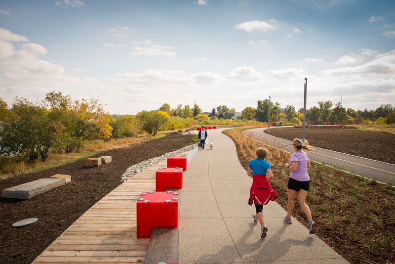As per the previous two phases of RiverWalk, Phase lll, has separate, delineated paths for cyclists and pedestrians. The divided commuter bikeway and the pedestrian pathway reflect the same surfaces and materials as previous phases; however, the pedestrian route is much more relaxed in terms of its meandering curves and absence of crossings and impediments. Plantings and vegetation include native and ornamental grasses that are reflective of the prairies and Bow River landscape. In tribute to the North West Mounted Police, who founded Fort Calgary, red cube-styled seating is featured along the path.