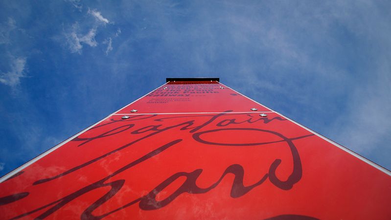 Each of the five scarlet-red Sentinels includes a fibre-reinforced concrete base and two ½-inch thick glass panels with a ‘graphical interlayer’ (that is, an image between them), all suspended from a hollow structural section (HSS) steel framework and lit by LED lighting strips. The images between the glass panels depict Calgary pioneers Captain Deane, Chief Crowfoot, Colonel Macleod and John Ayer.